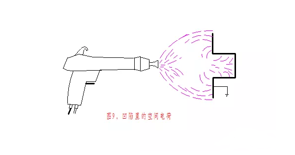 前文已经讲到,粉粒是通过输粉的气动力和电场力的输运被涂到工件上,这过程中的电场力必须要有足够强的电场才能做到。图7表明,无论是喷枪电极产生的电场,还是喷枪与工件间粉粒与自由离子形成的“云团”的电场都不能深入到深凹处内(法拉第笼内),因此,能帮助深入喷到深凹部位里面的唯一可能助力就是在深凹部位里由气流传送的粉粒“云团”所产生的电场,如图9所示。